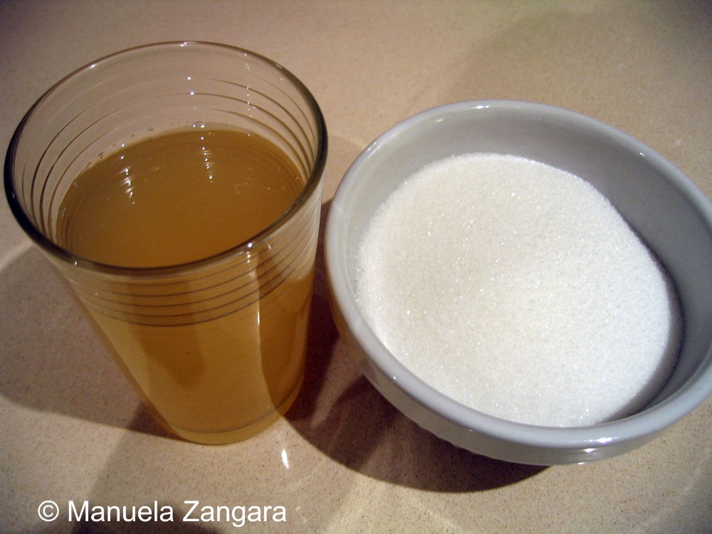 Weigh the left-over water from the cooked quinces and put it in a pot with the same amount of sugar by weight.