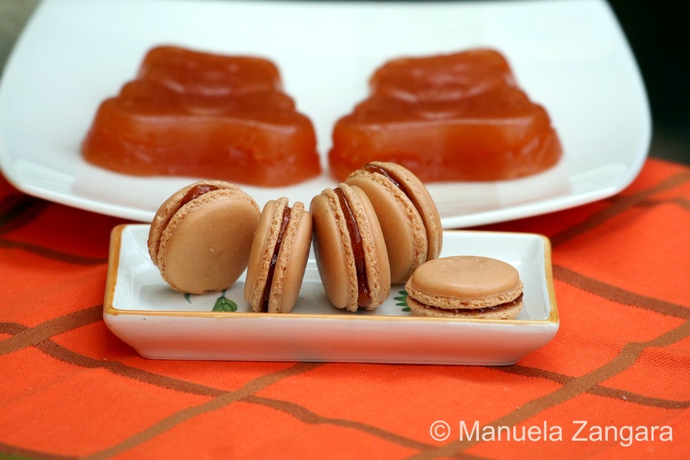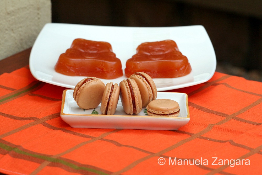 After making cotognata I had some left over “quince water” in which I had cooked the quinces… that liquid makes some fantastic quince jelly! But I did not want to eat the jelly by itself… I wanted to make something unique to celebrate a special occasion, but more on that later. What’s more special than the most delicate, light, delicious and elegant of all cookies? Yes, you guessed it right… I made another batch of macarons and sandwiched them with the quince jelly. And let me tell you, they were delicious!!! So, what’s this great occasion that we are celebrating? This is my 100th post! I almost cannot believe it, but it is true! And to show my readers a little love, I have decided to have a giveaway… my first! But we’ll get to it in a bit. For now let’s have a look at my quince jelly macarons and if you read the post till the end, you will find out all you need to know about my giveaway! Enjoy!