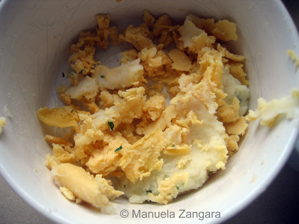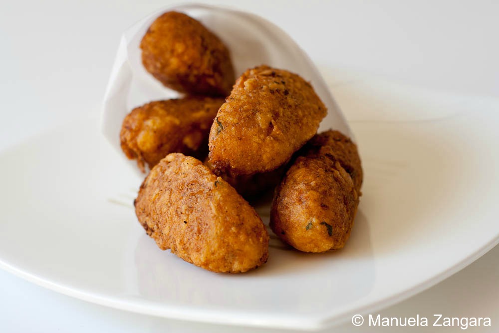 This dish was not originally included in my proposal to Foodbuzz for my 24×24 event on Sicilian Street Food New Year’s Eve Party: it was a spur of the moment decision. As they turned out great, I am sharing the recipe with you as well! It is really not a recipe per se, but it was a way for street vendors not to throw away the left overs that remained from the panelle and cazzilli mixtures: they would scrape off all the left overs, turn them into rascature (which literally means “scrapings”), fry them and sell them! Ingenuous, isn’t it? But I am so glad they came up with this idea or we would be missing out on yet another delicacy! Enjoy!