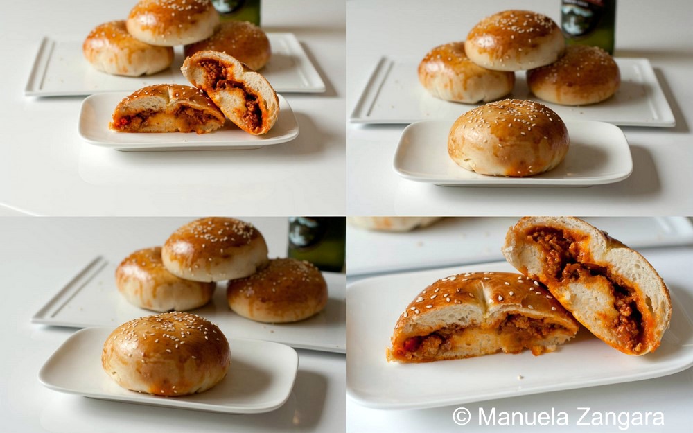 Ravazzate are yet another great street food dish from Palermo, in Sicily. They are soft buns, filled with a thick and delicious meat sauce, covered in sesame seeds and then baked. I love them! Among all sorts of fried (yet amazing) street food items to choose from, these never fail to be among the items I choose. The bun recipe can be used for many different fillings (even sweet ones), so it is definitely a keeper to make and remake, experimenting with it. This, however, is a traditional recipe and it is part of my Sicilian Street Food New Year’s Eve Party 24×24 event! Enjoy!