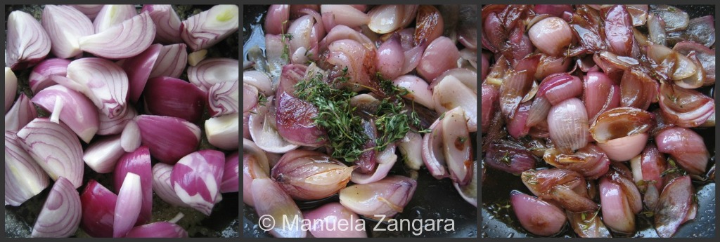 Add the red onion wedges and cook them on a slow fire for 10 to 15 minutes, stirring until caramelised. Add the vinegar and thyme, salt and pepper and let the onions cook till the liquid is fully absorbed.