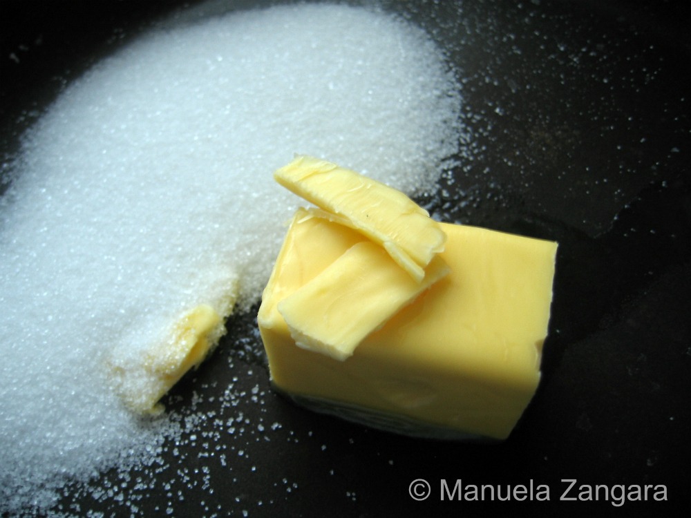 Put the butter and sugar in a frying pan and let them melt until well combined.