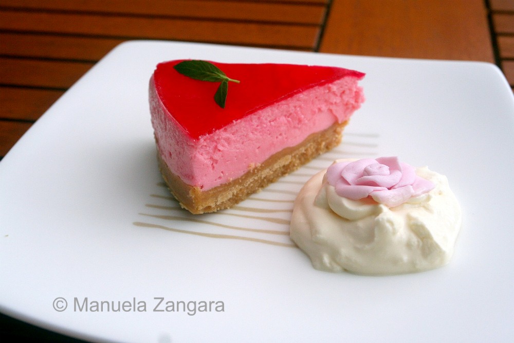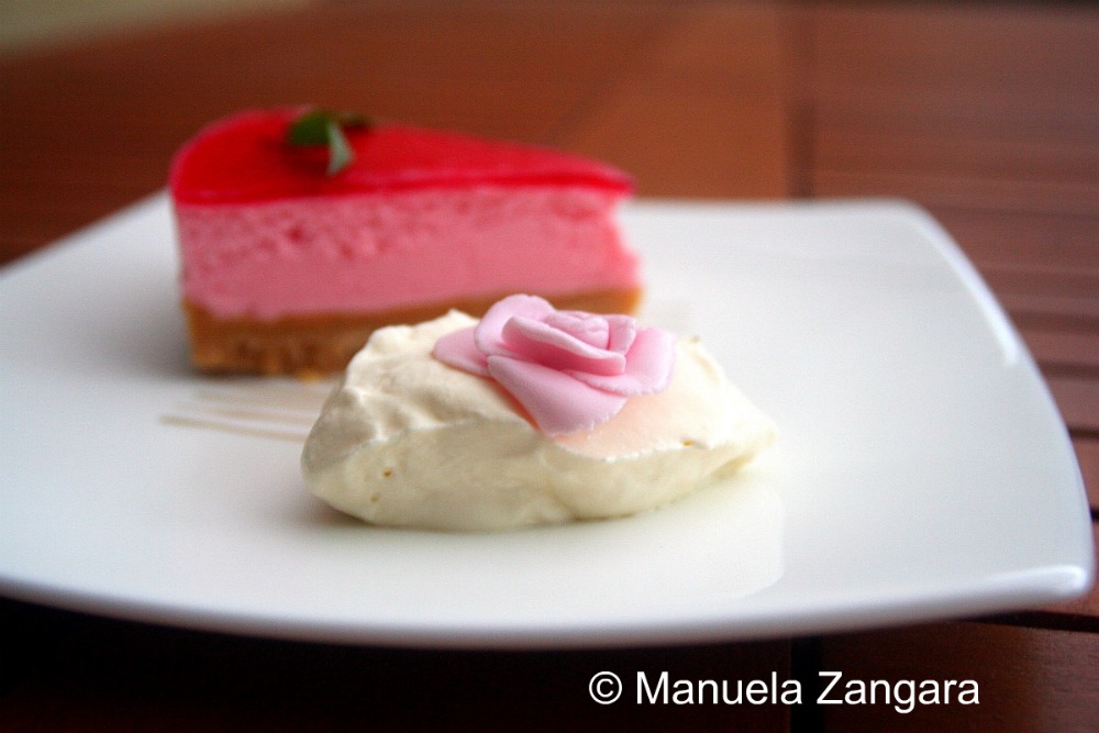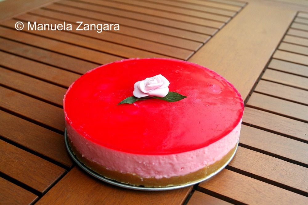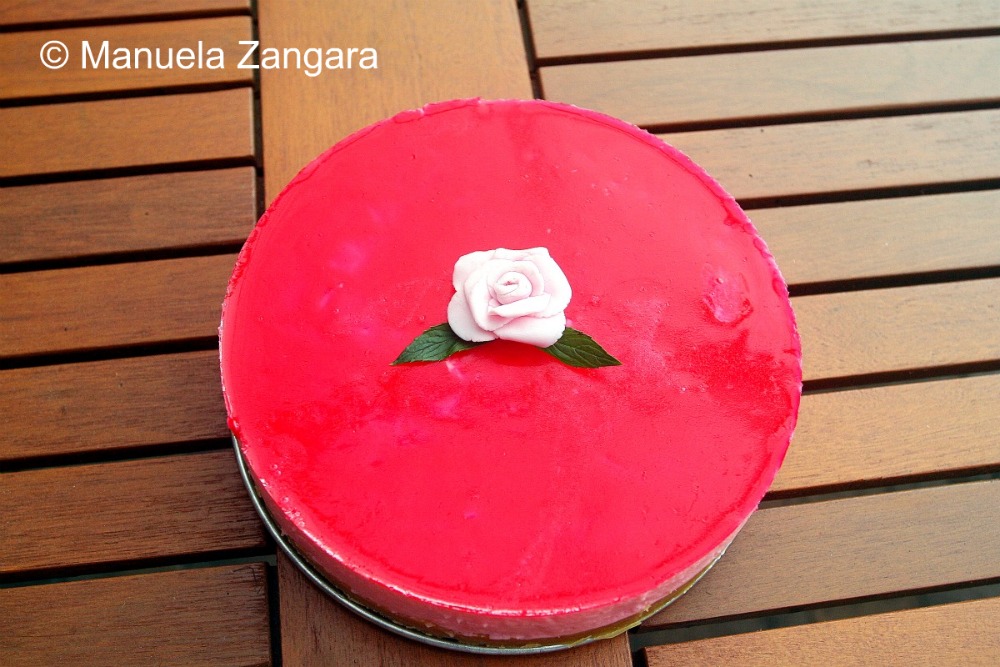 Manu, what a gorgeous cake. There is something ultra luxurious about using flowers in food and my mouth is watering at the thoughts of the lovely rose flavoured cheese filling. I love the vibrant colour of the gel topping against the more delicate pink of the filling – wow!