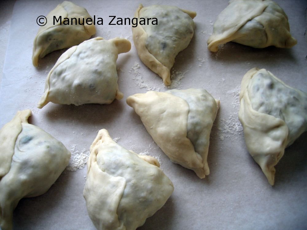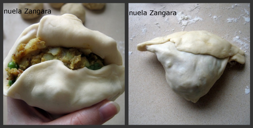 Cut these ovals in half and fold them to make cones, as shown in the pictures. Seal the edge with some water and press it to close it tight. Hold the cone in your left hand and fill it with the stuffing. Close it by folding the open part on the top and seal it with a little water.
