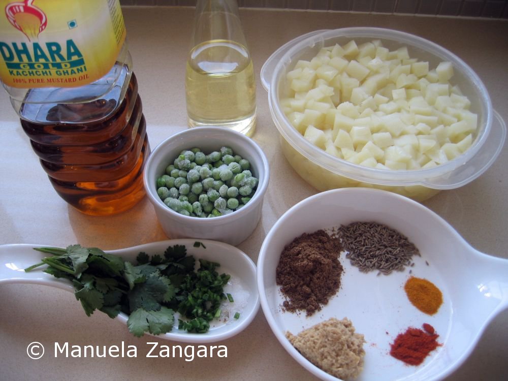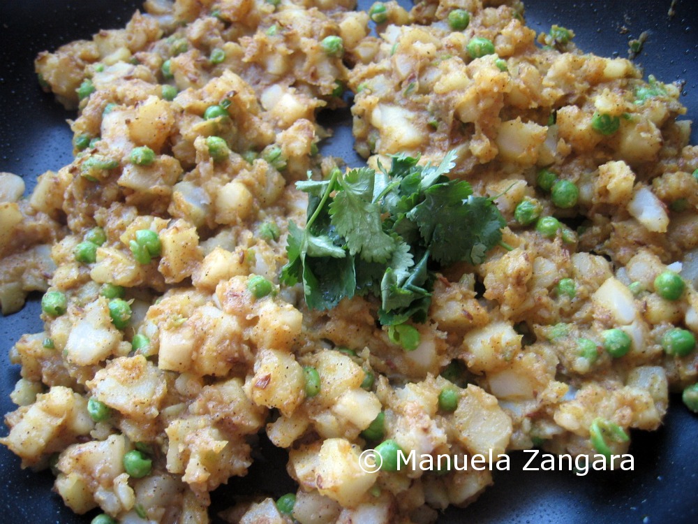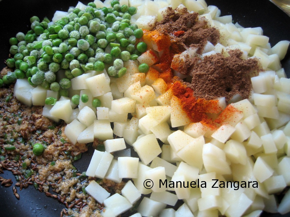 Add the cooked chopped potatoes (including the water they have accumulated while cooking), chilli powder, turmeric, peas, garam masala and salt to taste.