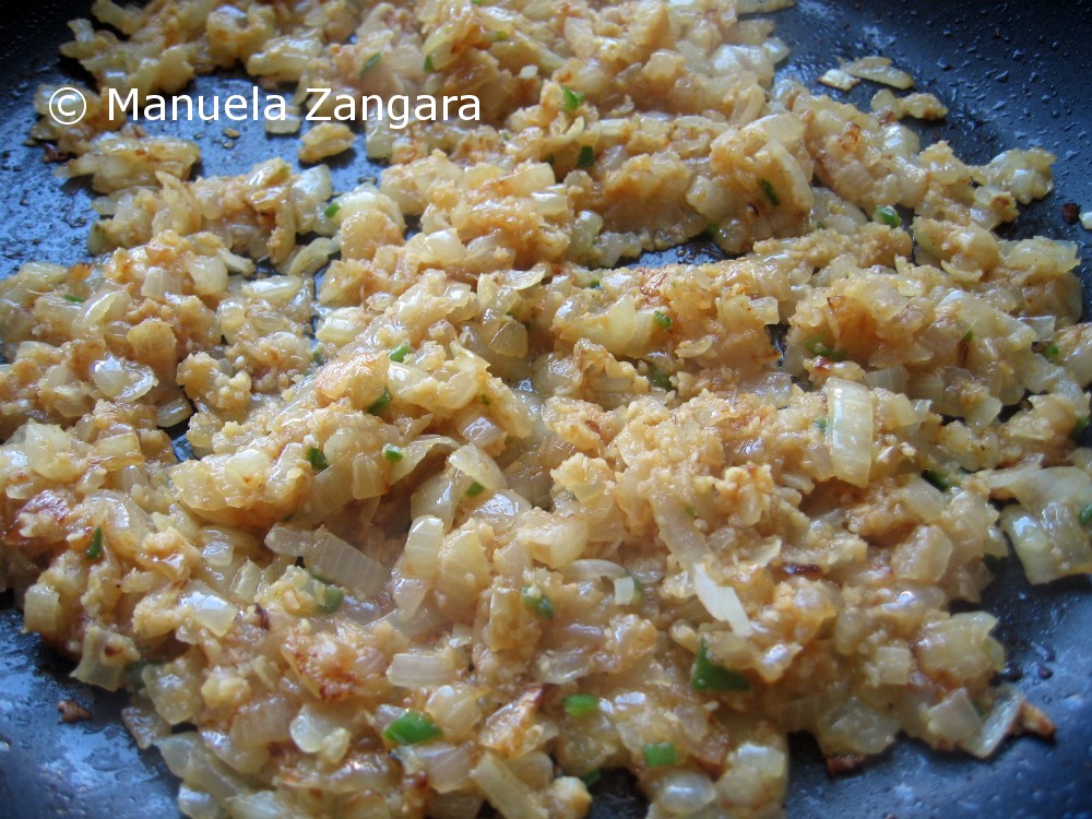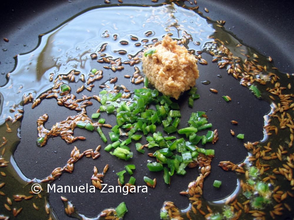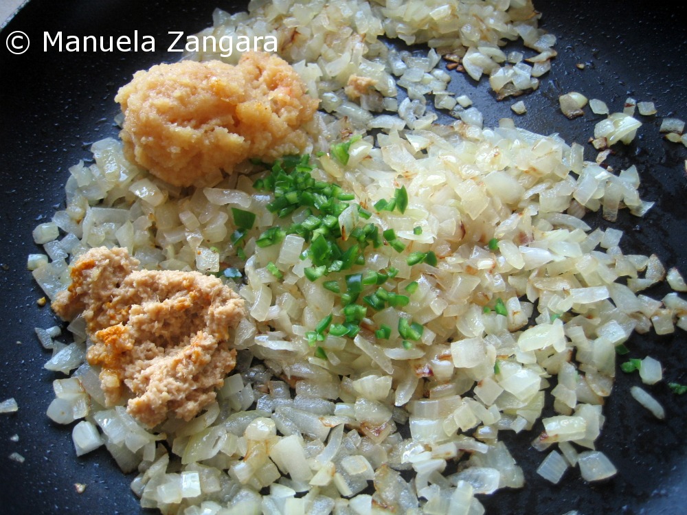 Put the chopped onions and the vegetable oil in a frying pan and sauté until lightly browned. Add the ginger, garlic and green chilli and sauté for a couple of minutes.