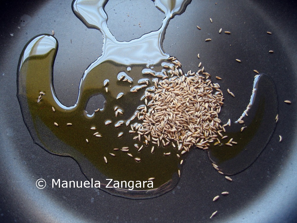 Put the cumin seeds, vegetable oil and mustard oil in a frying pan and let them fry until they start popping.