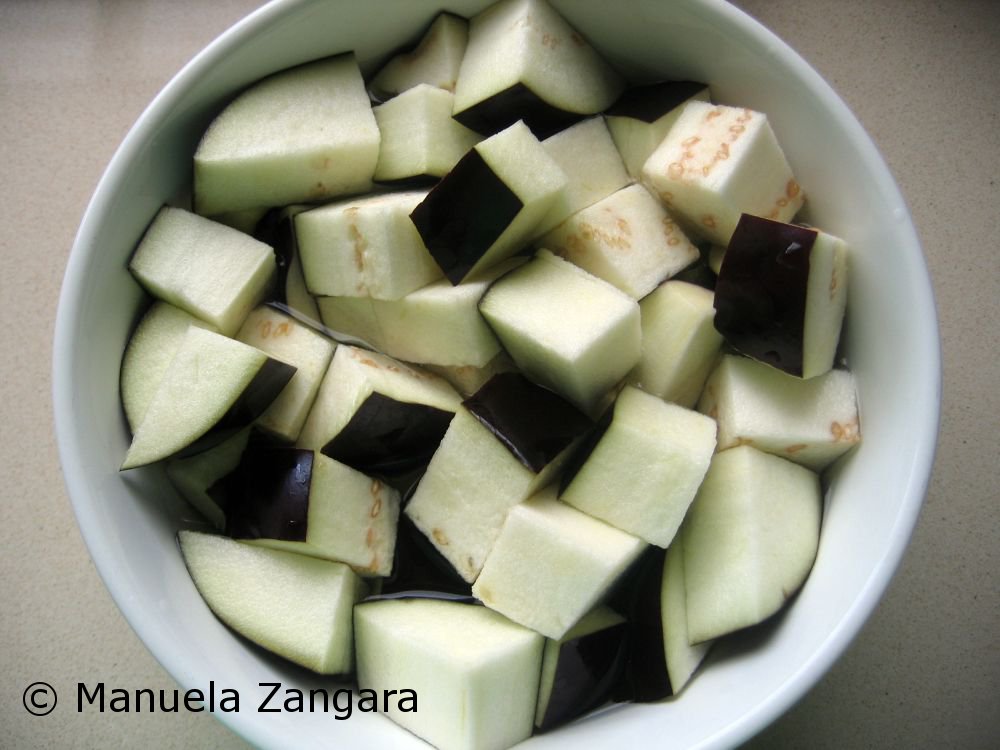 In the meantime, cube the eggplant into 3 x 3 cm pieces and put them in a bowl filled with salty water. Keep them in the water for half an hour. This will make the eggplant less bitter.