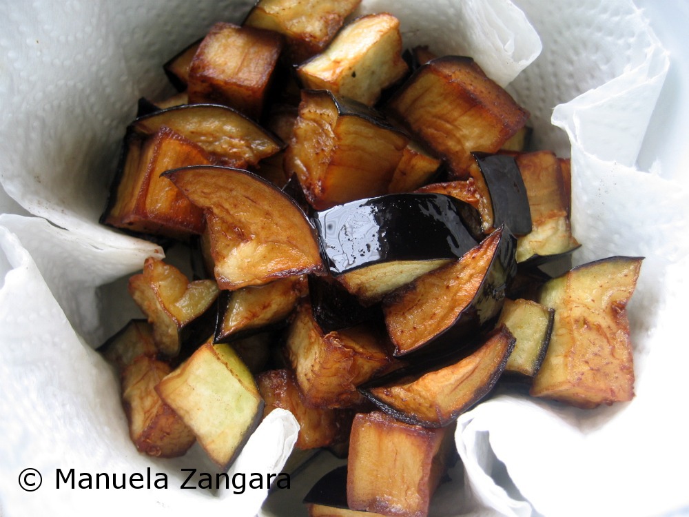 Remove the eggplant from the water and dry it well. Deep fry it in hot vegetable oil and add to the cooked swordfish and tomato sauce. Add the chopped herbs and mix well.