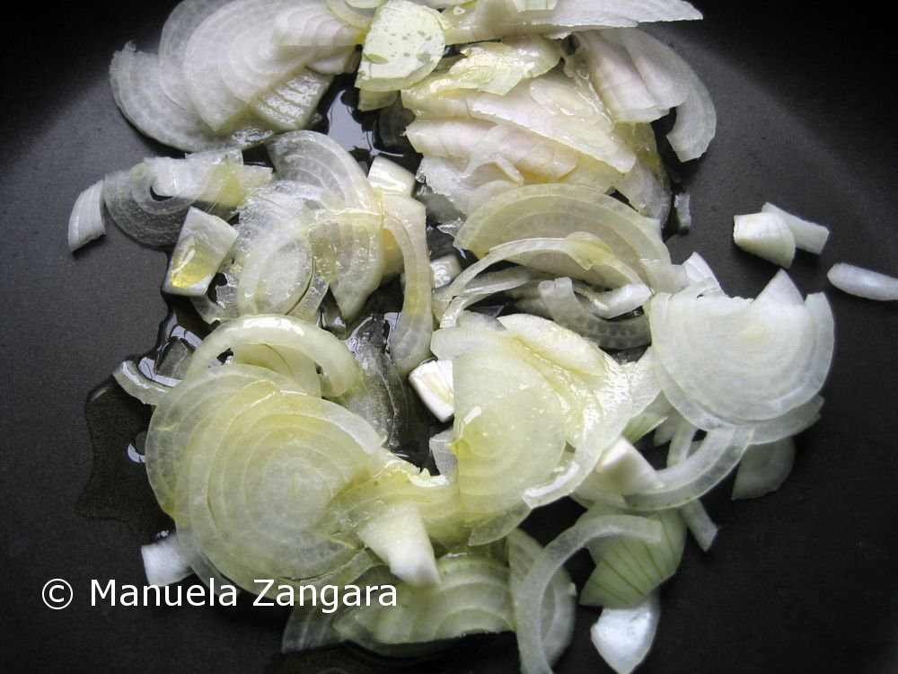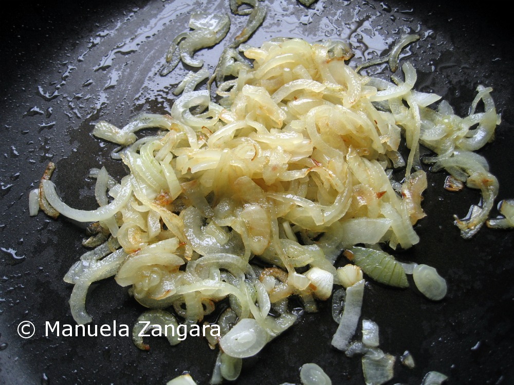 Thinly slice the onions and put them in a frying pan with the extra virgin olive oil. Sauté on a low fire until the onion is soft and translucent.