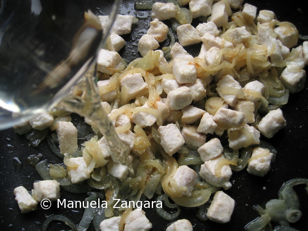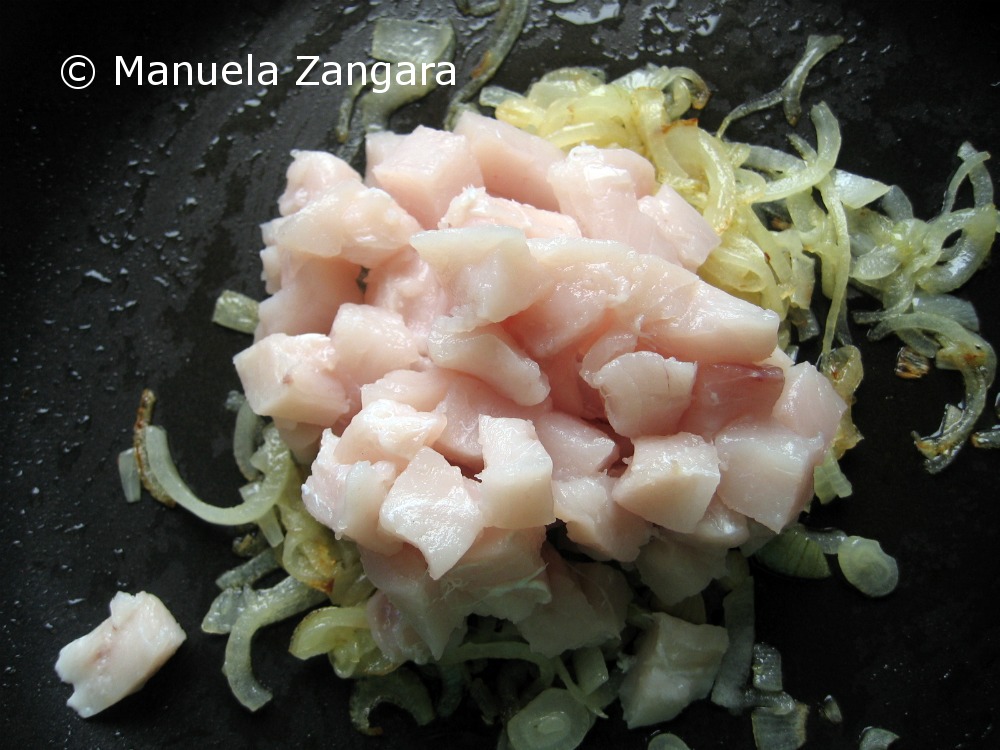 Add the cubed swordfish and cook it on all sides. Add the white wine and raise the flame to burn the alcohol off.