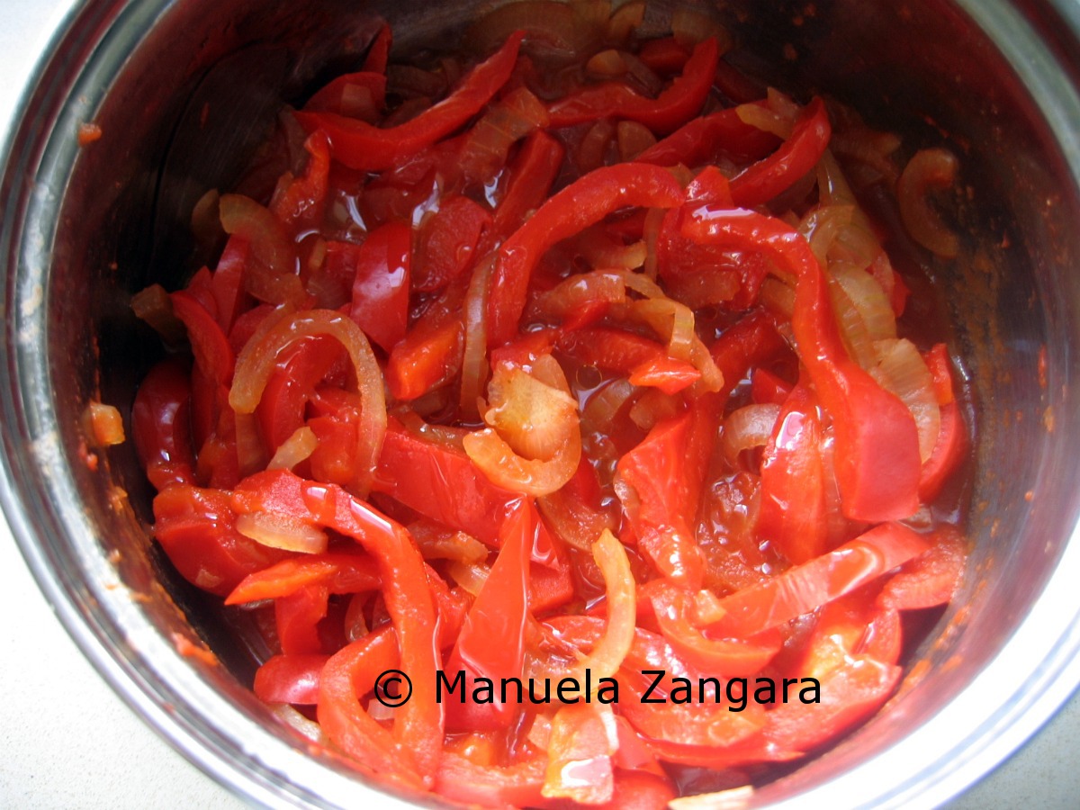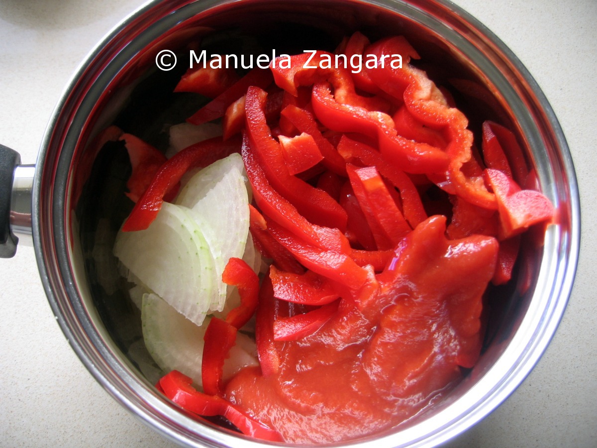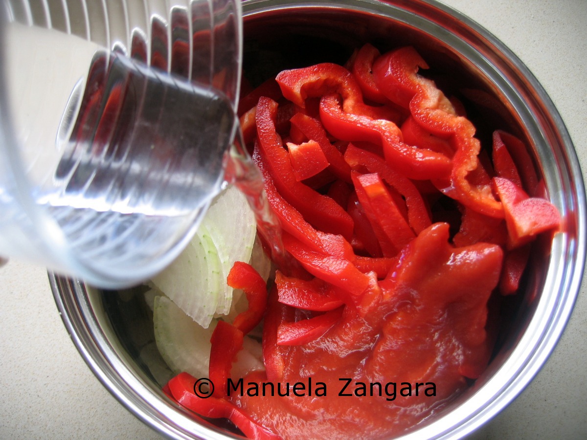 Put the sliced onion, the tomato puree and the red capsicum strips in a pot. Add half a glass of water, cover it and let it cook on a low fire until the capsicum is soft.