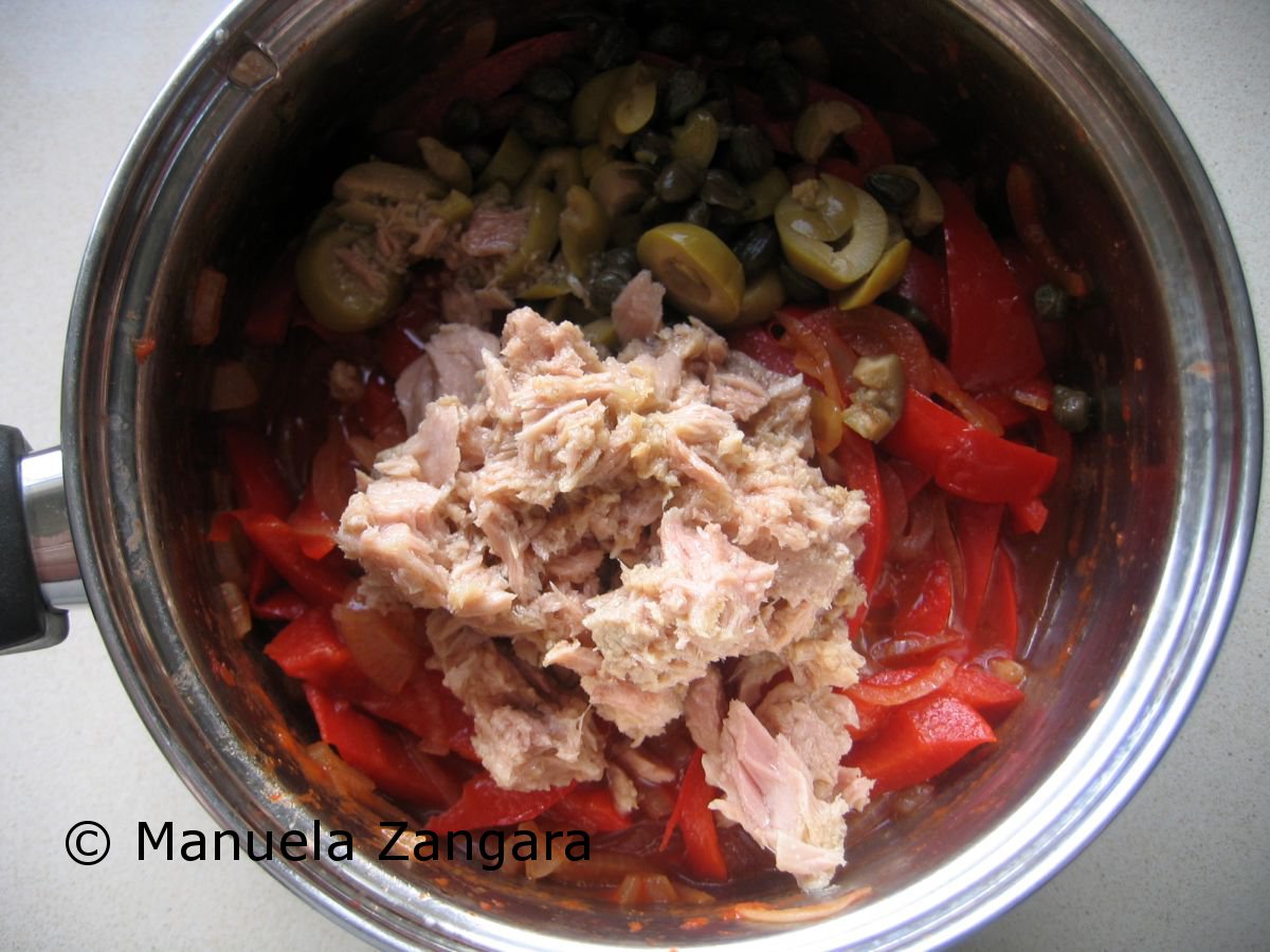 Add the tuna, olives and capers. Mix well and cook for 2 minutes. Add salt to taste (if required) and a little water if the sauce is too thick.