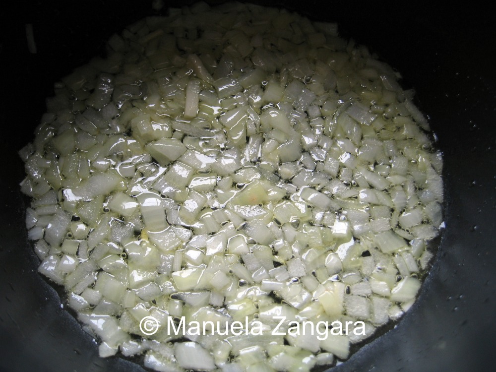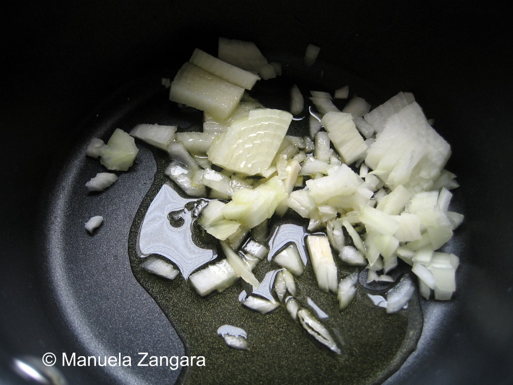 Thinly chop the onion and put it in a large pot with the extra virgin olive oil.