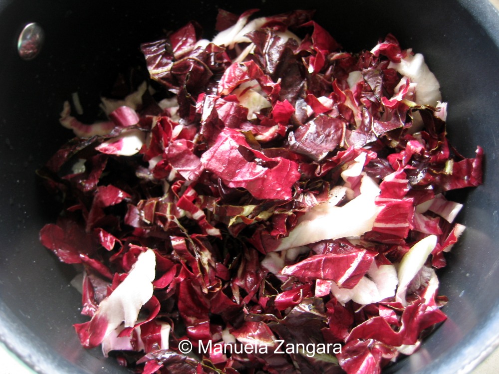 Cover and let it cook on a low flame for about 10 minutes. You should not have to add water as radicchio usually creates a little liquid while cooking, but do keep an eye on it and adjust as needed. Your end result has to be rather dry though. When cooked, keep aside until cool.