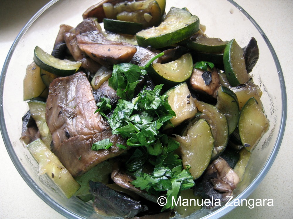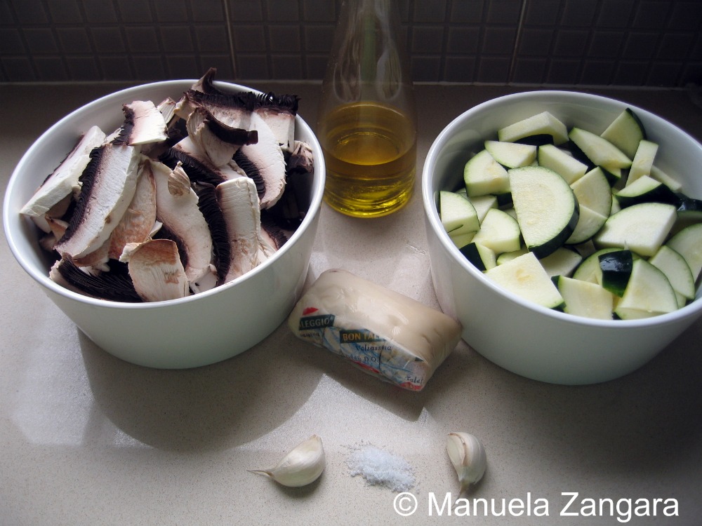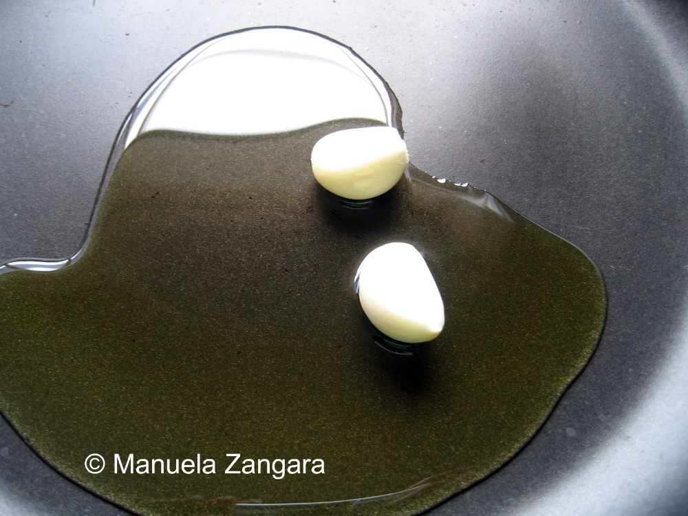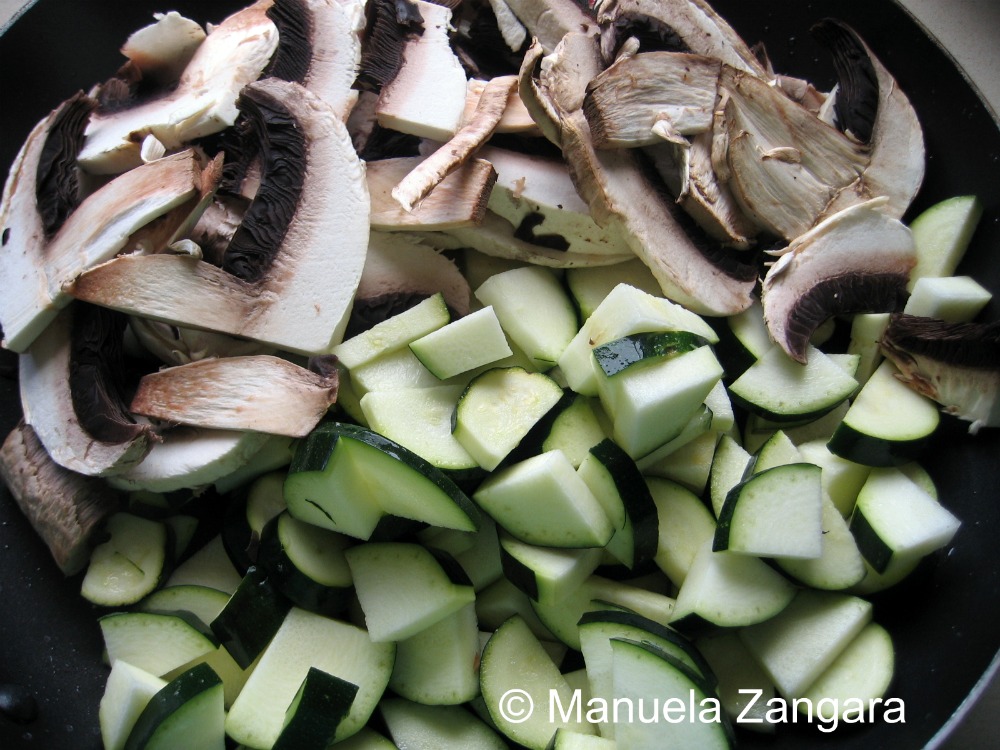Now chop the zucchini and slice the mushroom. Put the cloves of garlic and the extra virgin olive oil in a non stick pan and sauté for a couple of minutes.