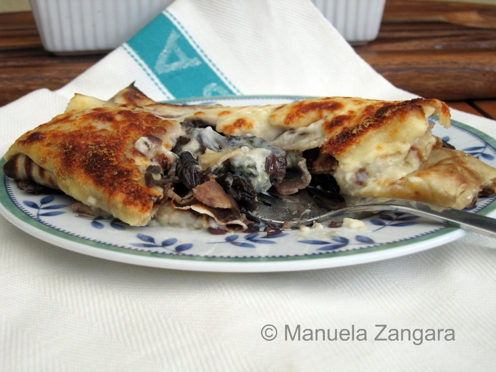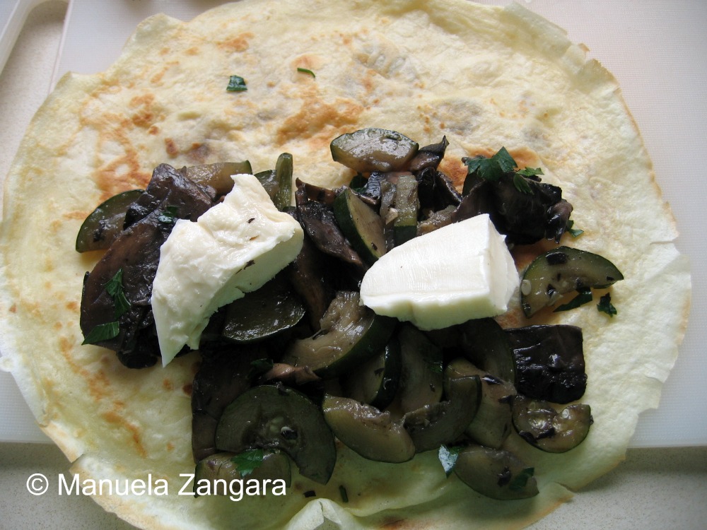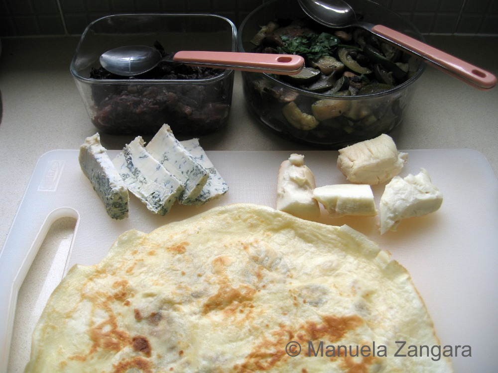 Put radicchio and gorgonzola in one half of 4 of the crespelle, and put zucchini & mushrooms and taleggio in the other 4.