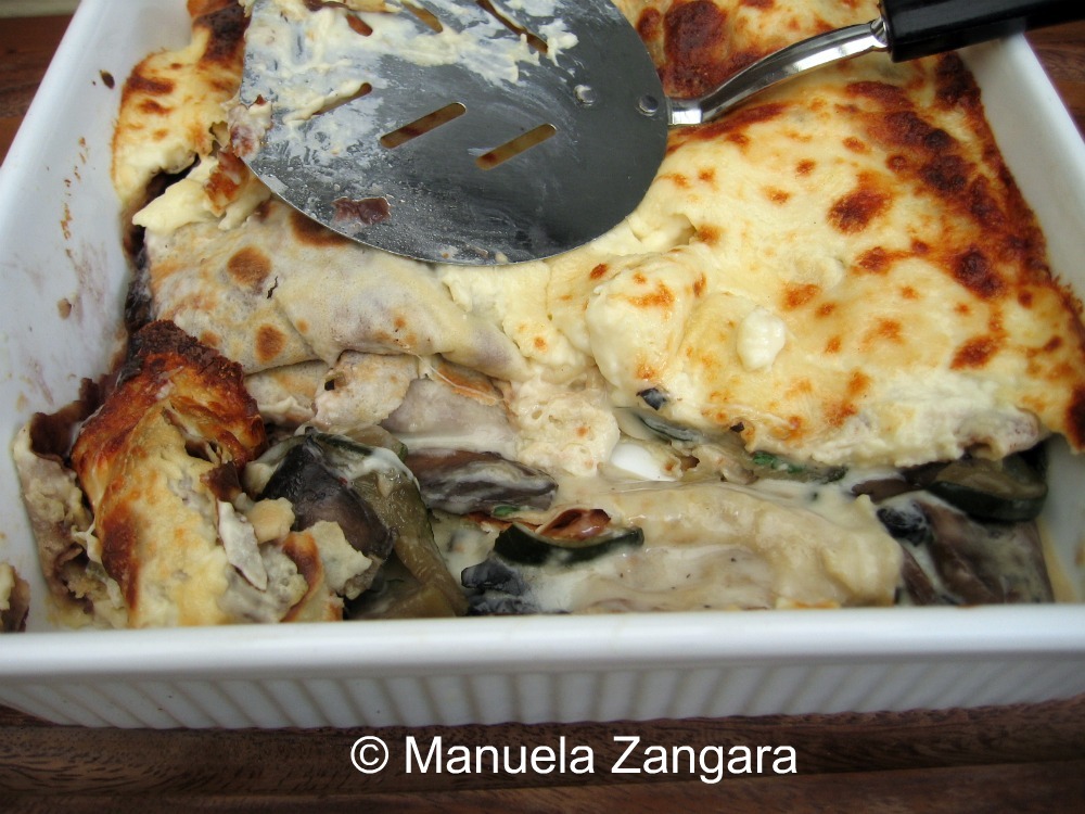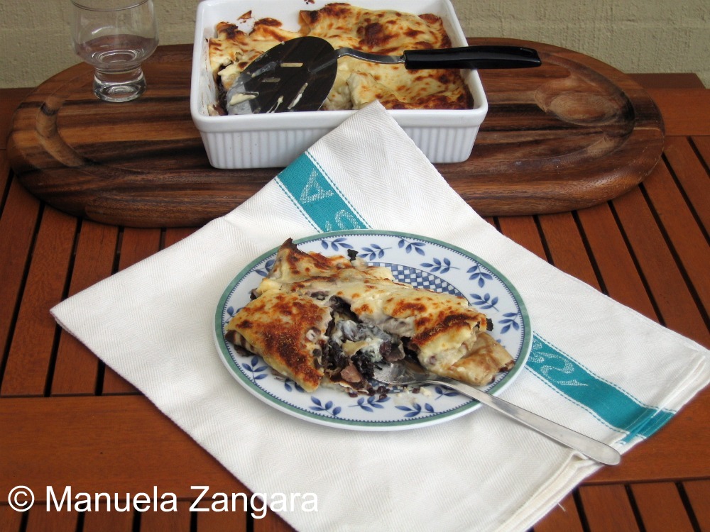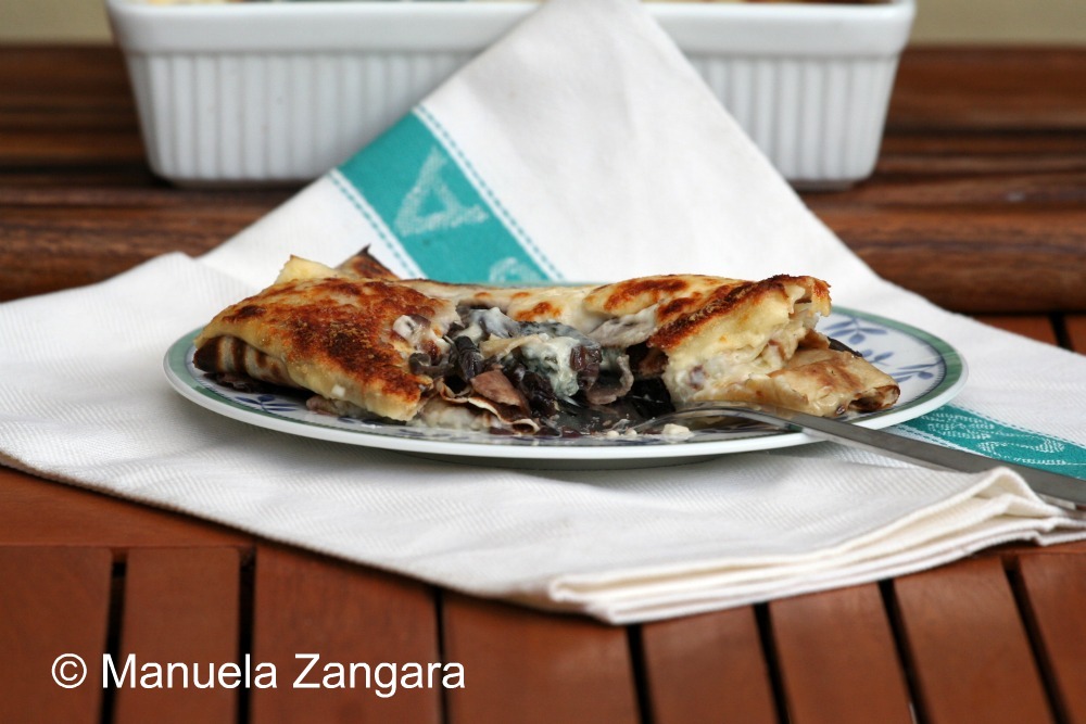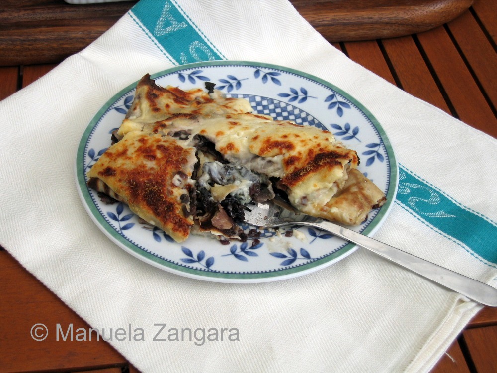 This is definitely a “winter dish” and one of my favourite comfort foods. There is nothing better than to dig your fork into a soft crêpe-like wrap covered in béchamel sauce and grated Parmigiano and seeing the vegetables and cheese filling oozing out of it… Ok, if your mouth hasn’t started watering by now, there’s something wrong with you or with my description… just scroll down for some pictures and you will know what I mean! Crespelle are basically Italian savory crêpes that you can fill with whatever you like (usually the fillings are cured meats and/or vegetables AND cheese), topped with béchamel sauce and then baked until a nice golden crust forms on the top. They are a great dinner treat and even if a bit time consuming, you can make them over a couple of days as the fillings and the crêpes can be easily prepared in advance and kept in the fridge till you are ready to assemble and bake the dish. Enjoy!