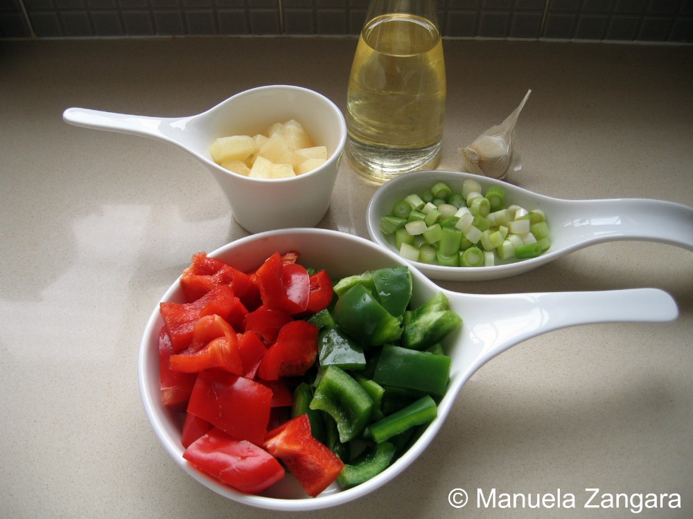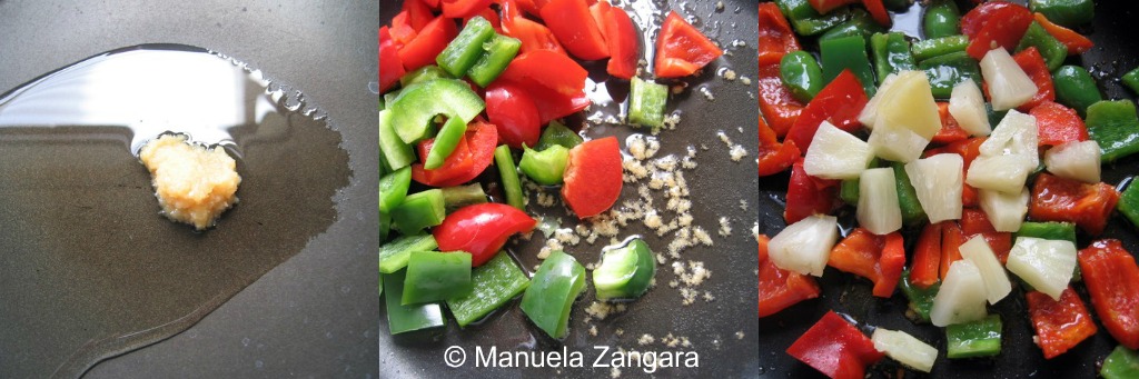 Heat up a wok and add some vegetable oil. Add in the chopped garlic and stir fry until light brown, then put in the capsicum and pineapple pieces.