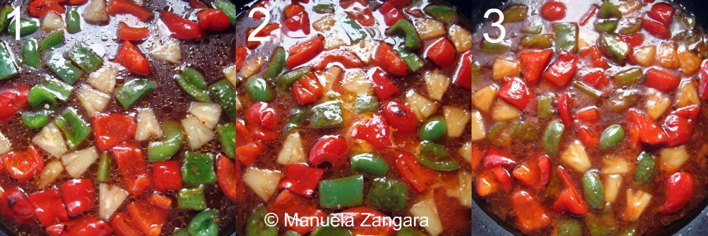 Stir fry for a couple of minutes and then add the sweet and sour sauce (without the corn starch mixture) (1). Let the mixture come to a boil. Reduce the heat and simmer for about 1 minute, stirring, to allow the flavors to blend. Stir in the cornstarch mixture (2) and heat until the sauce is glossy and tastes cooked through (3). Turn off the heat and cover to keep warm.