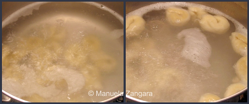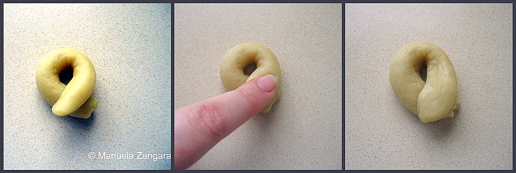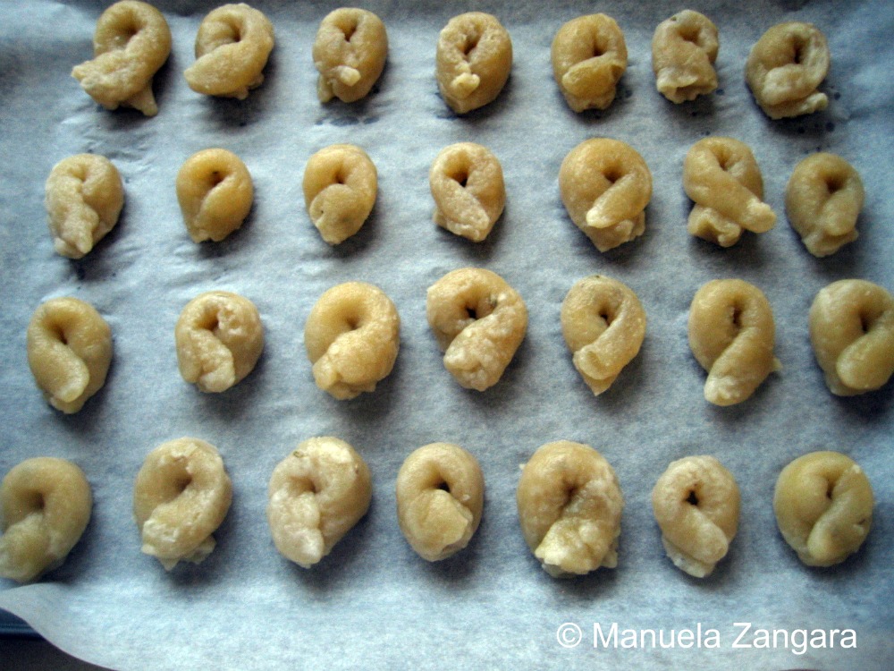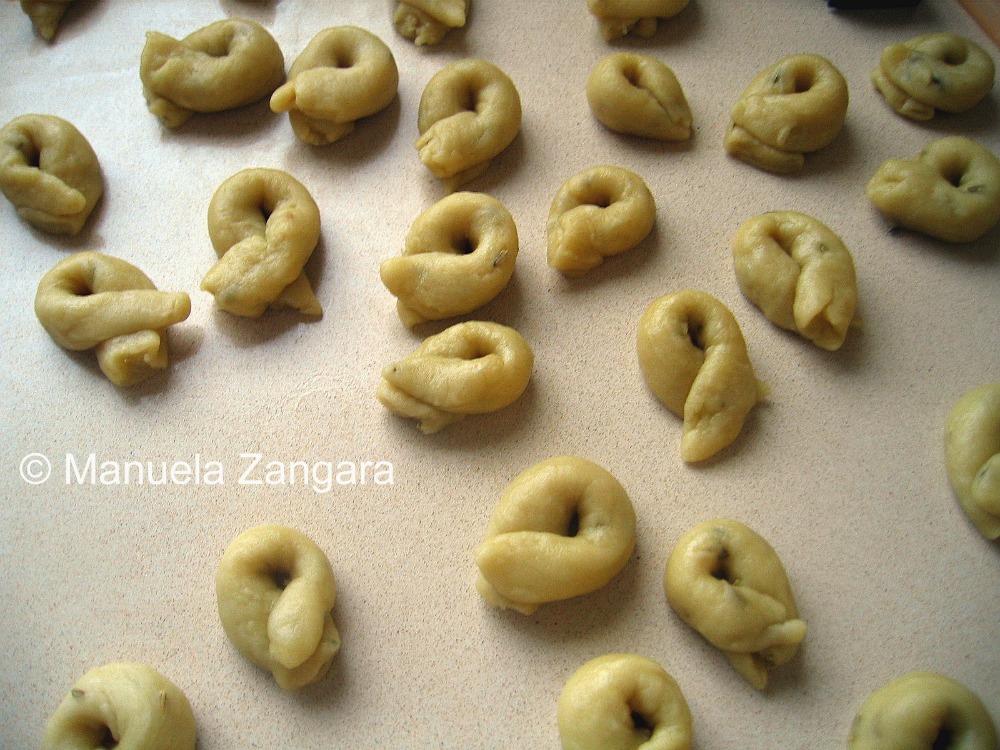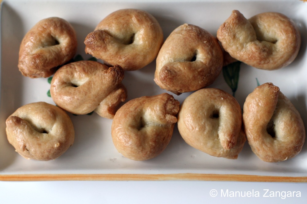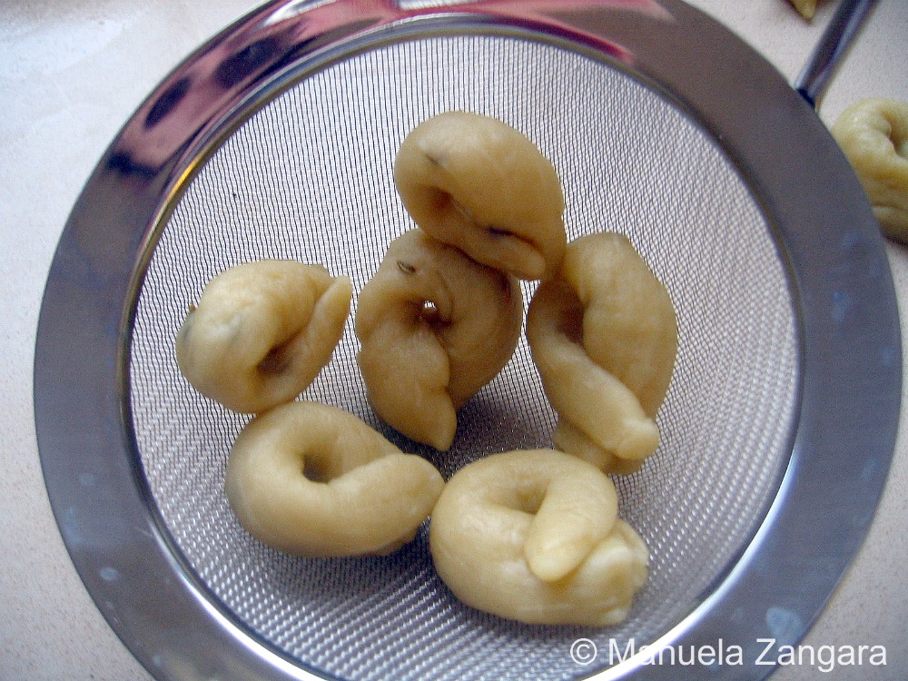 In the meantime, put some water in a pot and bring it to a boil. When it boils, drop the taralli into it a dozen at a time. Remove them with a slotted spoon as soon as they come up and start floating.