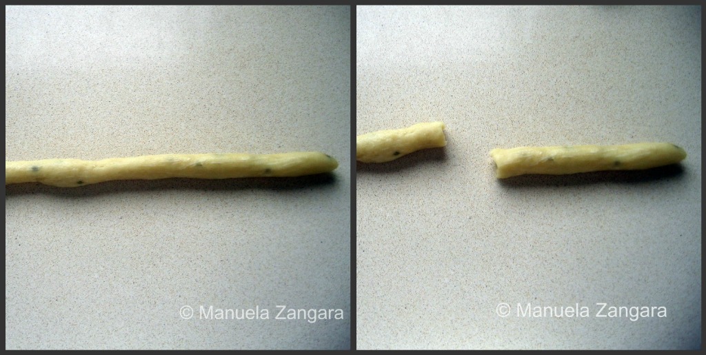 Then divide the dough in small pieces and roll them into ropes about 1 cm (1/2 inch) thick. Cut these ropes into segments approximately 8 cm long.