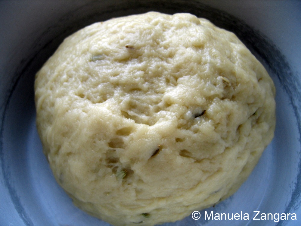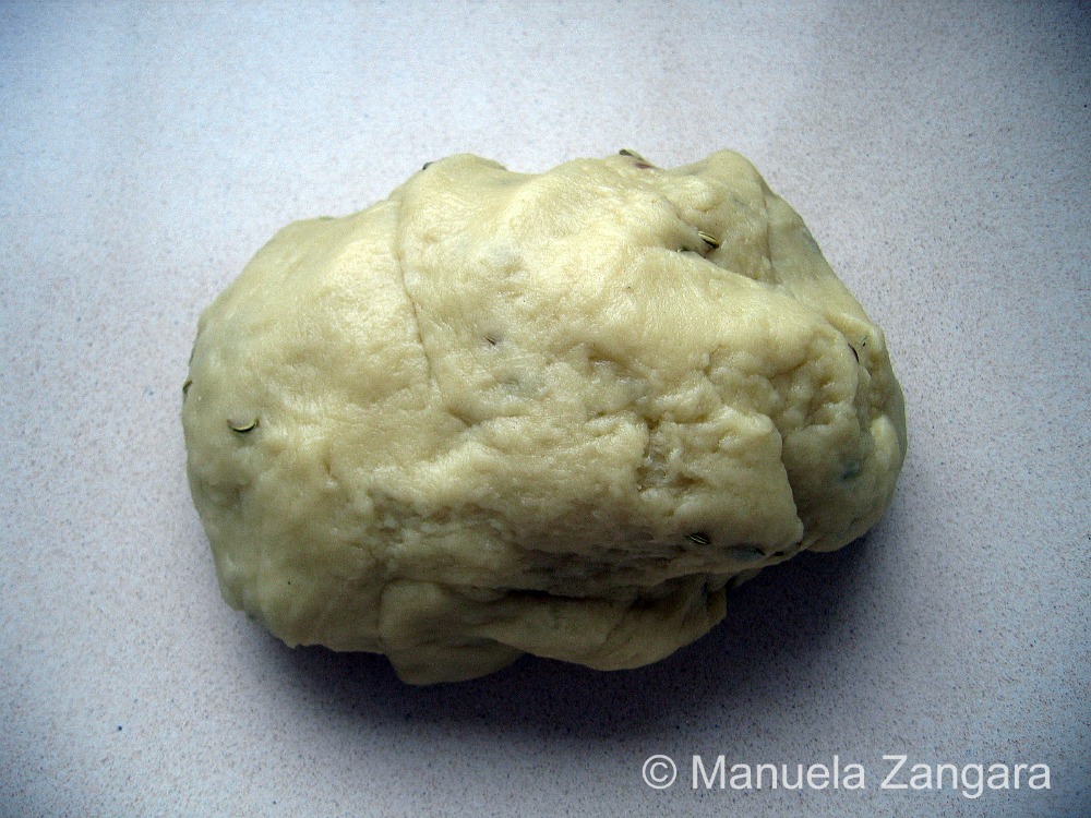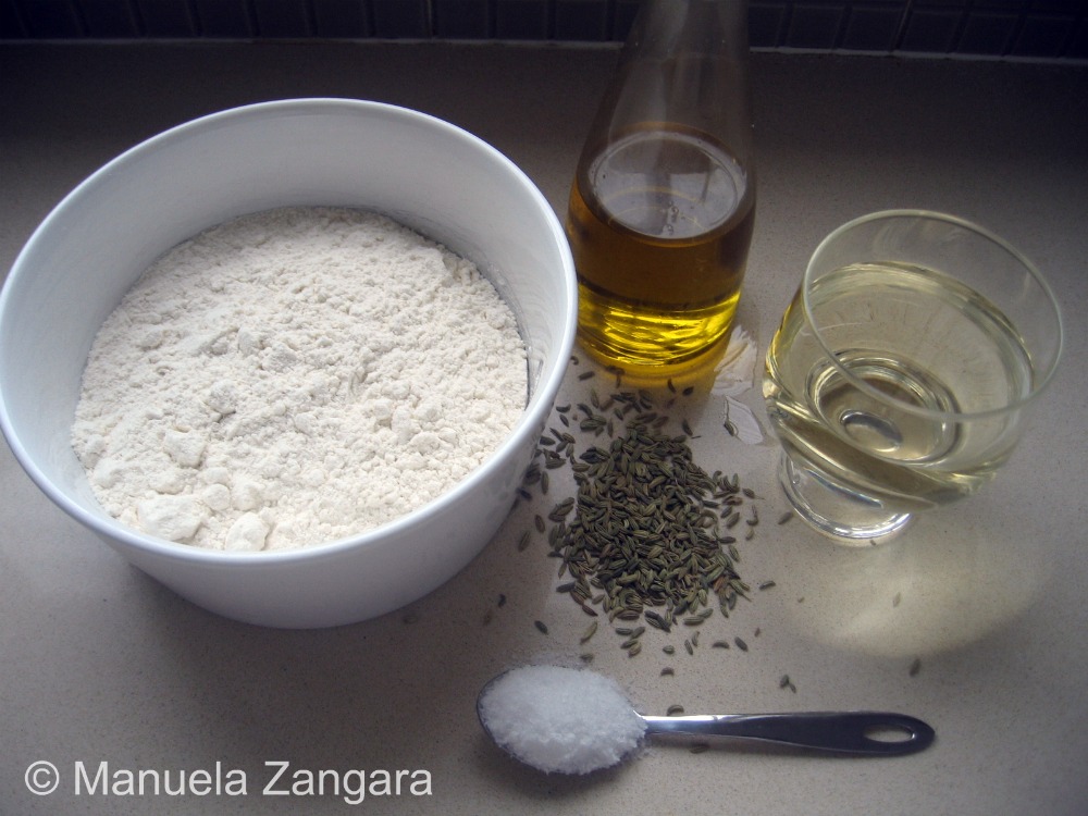 Put the flour, extra virgin olive oil, salt, white wine and fennel seeds in a mixer with a dough hook and knead for 10 minutes until you get a smooth and pliable dough.