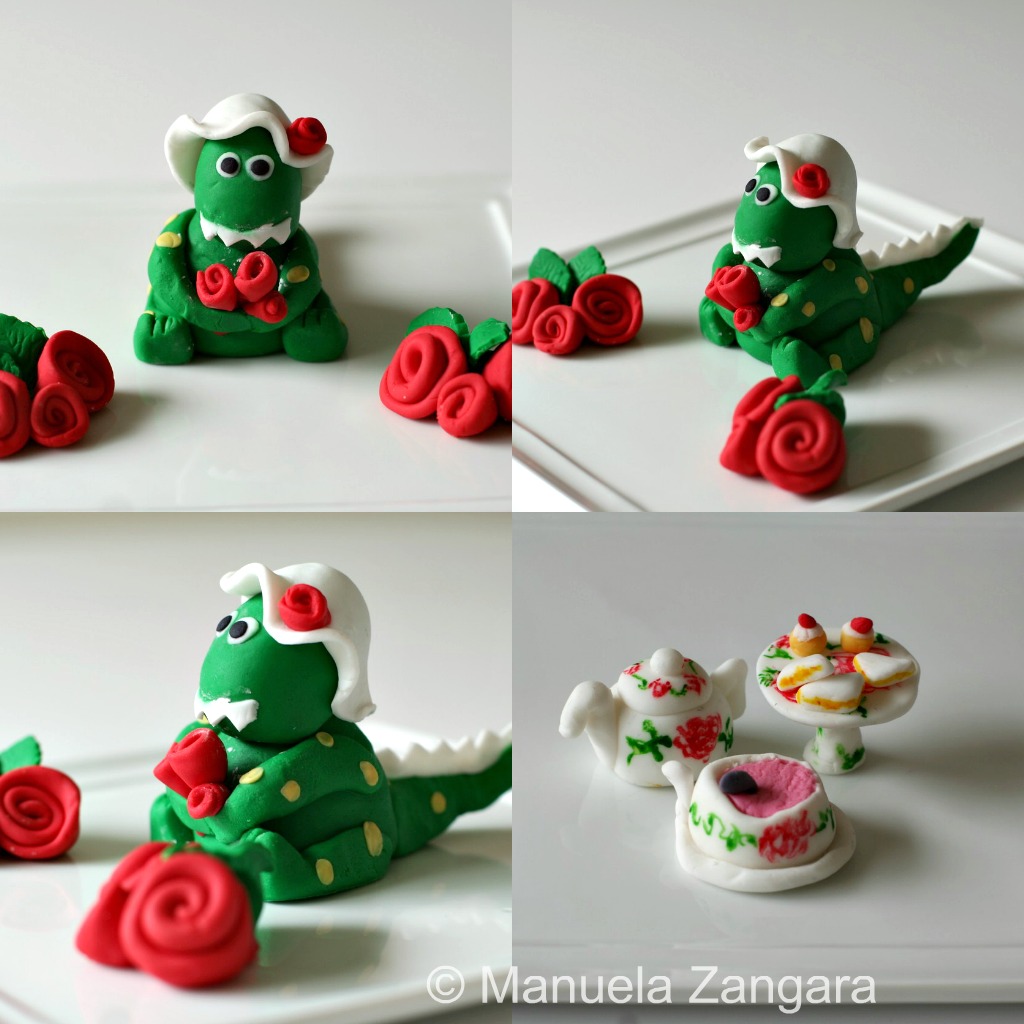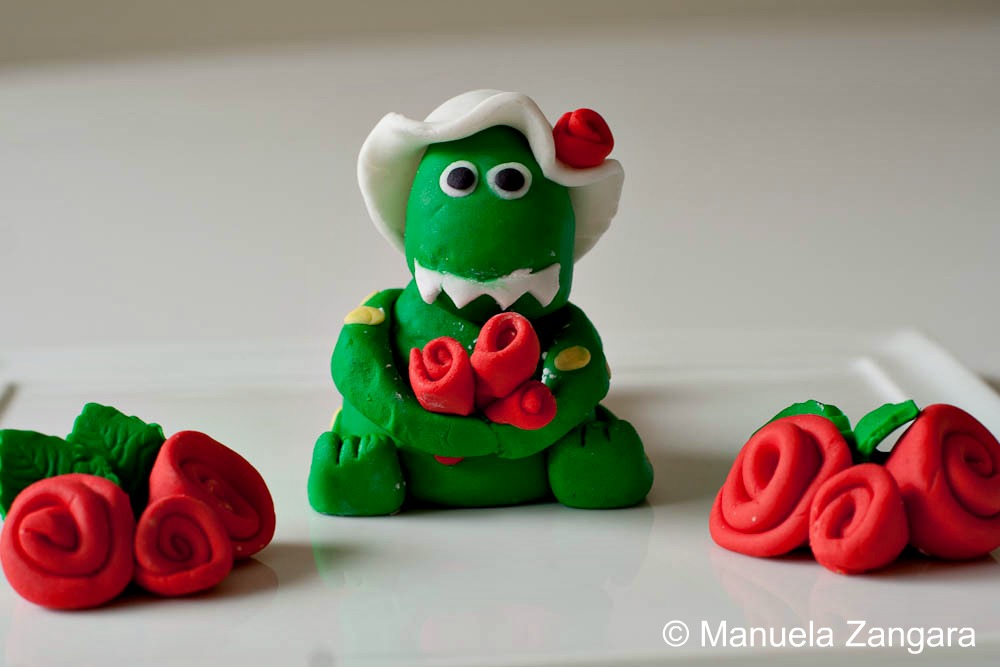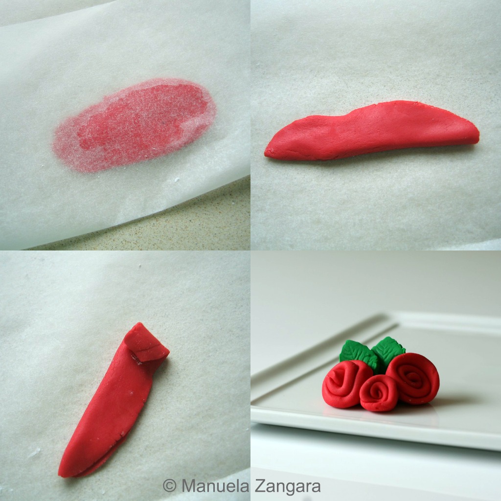 I started by making Dorothy. I made her body and head first by rolling two oval shapes and I stuck them together with a little water and half a toothpick. Then I made the tail and I stuck it to the body in the same way. After that, I made the legs and feet and hands. Then I rolled some thin strips of red fondant, folded it on itself and then rolled it to create 4 small “ribbon roses” and I attached 3 of them between her hands and her body with a little water.