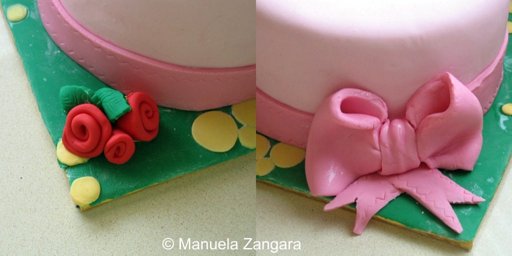I rolled out some darker pink fondant to make the string of the ribbon. Cut it into a long strip (I also added some “stich marks” using a pasta cutter) and apply it to the bottom of the cake with a little water. Cut out the excess, making sure that the joint is where you are going to put the bow, so the joint will get covered by it. I also added the ends of the ribbon.