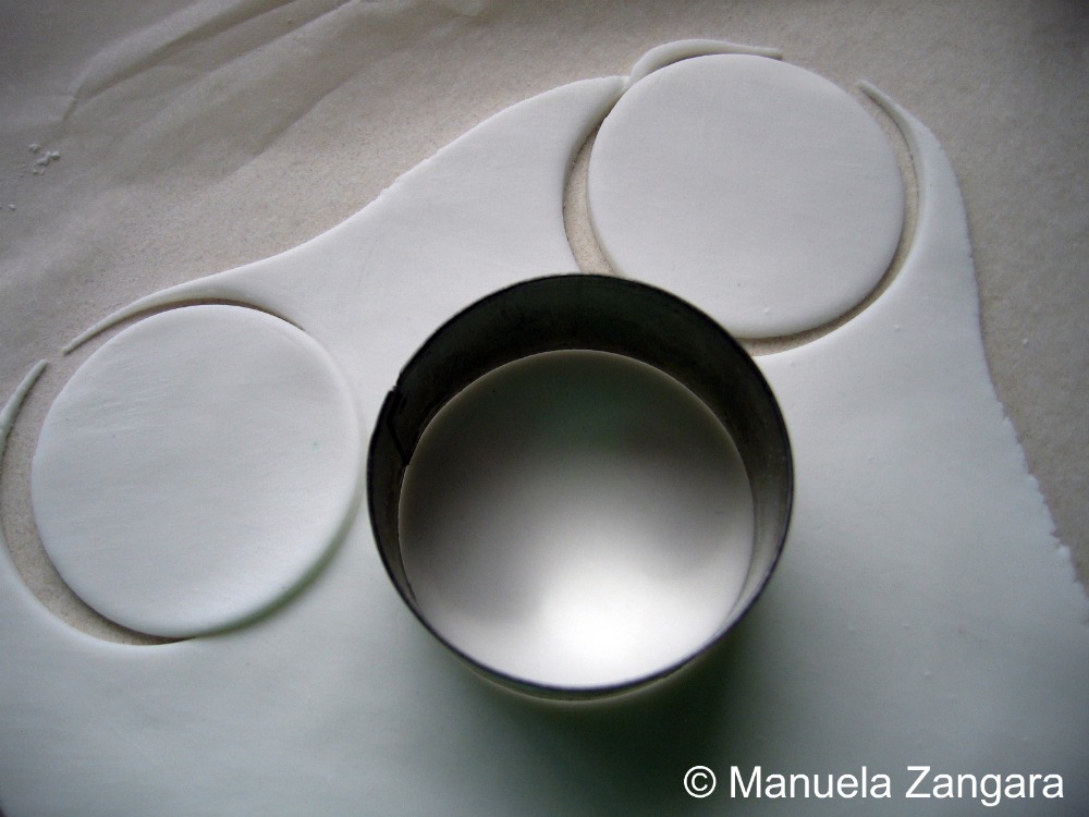 To make the hat, I rolled out some white fondant into a very thin sheet and cut out a circle. I attached it on Dorothy’s head (shaping it with my hands) using a little water. Let it dry for 1 hour and then attach the 4th rose onto the hat using a little water.