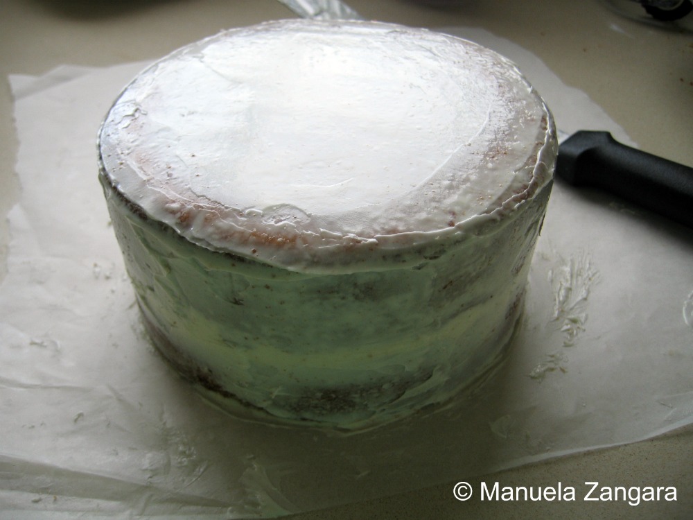 The day before the party I assembled the cake. I made some icing for the crumb coating (you can use your favourite icing recipe, just make sure that it is a little less dense as it needs to be smooth and you should be able to apply it easily). I took the 2 yogurt cakes out of the freezer and levelled them while still frozen with a sharp serrated knife.