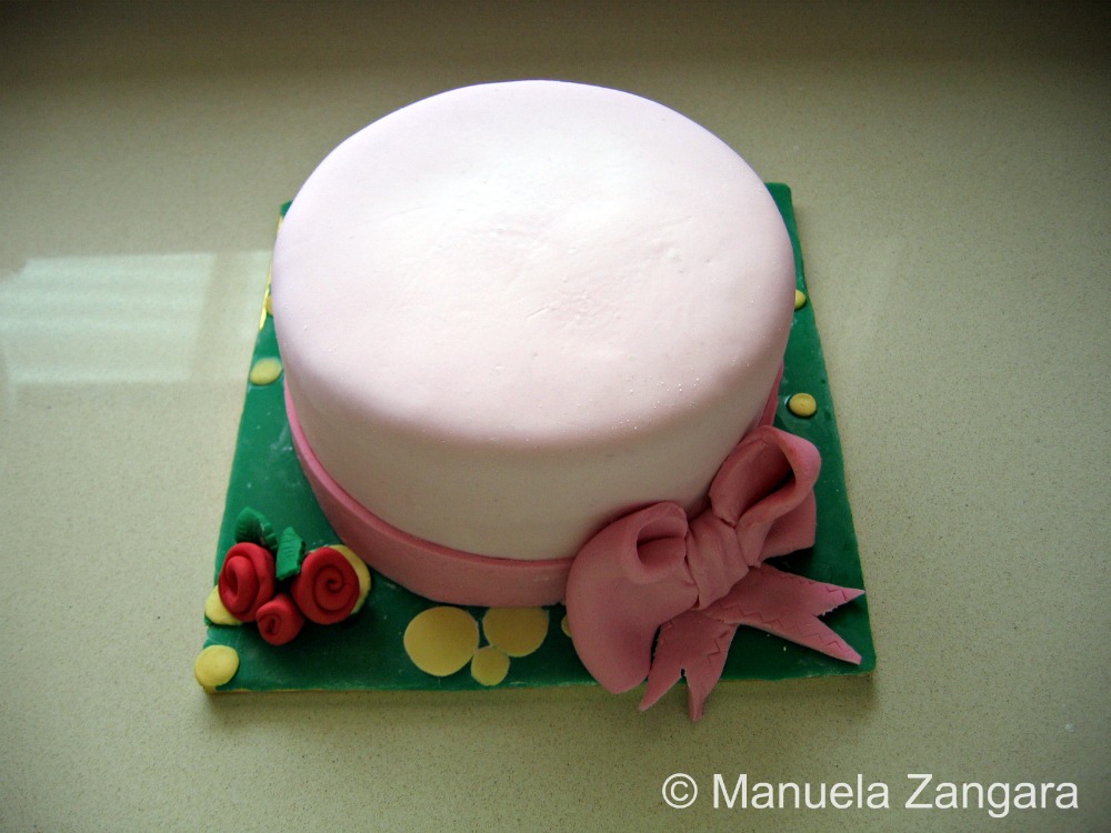 To make the bow, I followed this method: Cake Decorating – Making Ribbon and Bows out of Fondant.