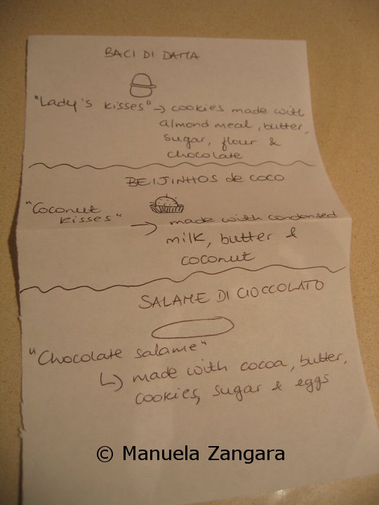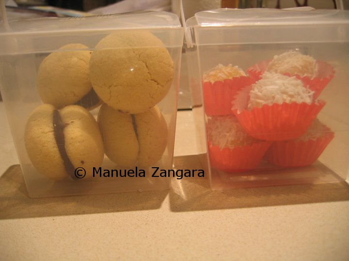 After thinking a bit about it, I decided to make some sweets. They had to be easy and fast to prepare (I still had 2 parties to organize!), but yummy and presentable at the same time. In the end I chose Baci di Dama (Lady’s kisses), Salame di cioccolato (Chocolate salami), and Beijinhos de Coco (Little coconut kisses). The first 2 are Italian, while the latter is Brazilian… but they have 1 crucial common trait: they are very fast to make!
