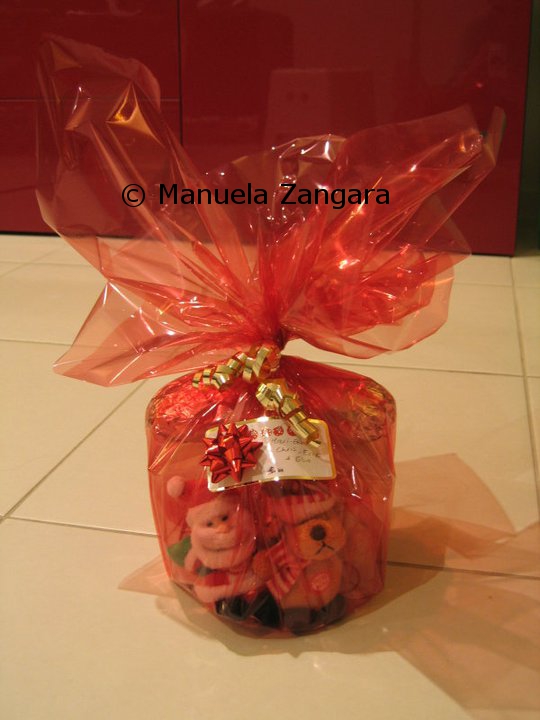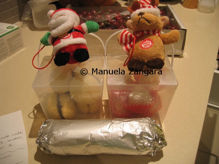 I then purchased some take-away-like transparent boxes and some red transparent cellophane paper from a local party shop. I also got some presents tags and ribbons, to personalize each parcel. Almost all our friends have very young children, so I included a small musical Christmas tree decoration for each child. I also wrote a note explaining what was inside the parcels and what ingredients l had used to make the sweets, just in case our friends had any food intolerance that I was not aware of.