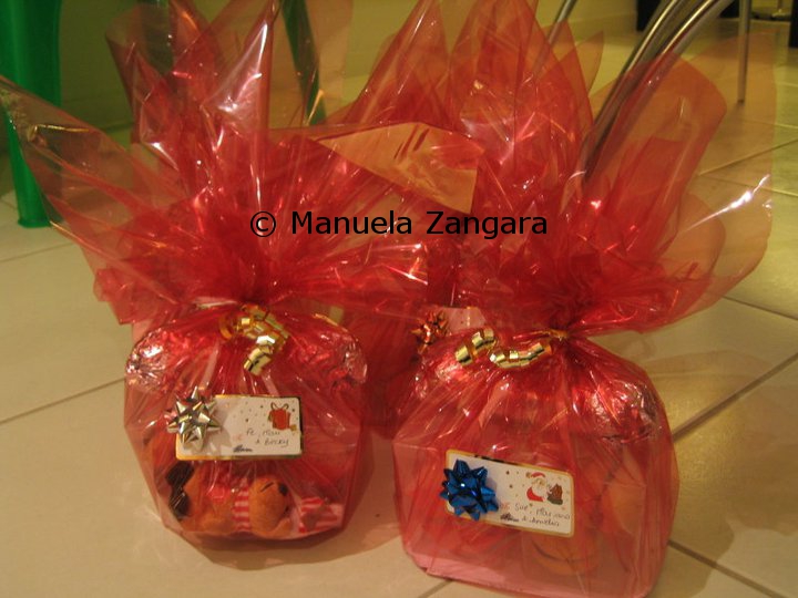 and then made the parcels with the cellophane paper and the ribbons. I wrote the names of our friends on the tags and attached them to the parcels. Here is the final result:
