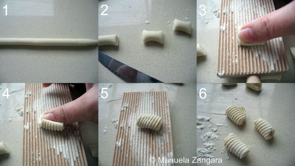 Now you are ready to transform the dough into pasta. Divide the dough in 8 to 10 balls. Roll each ball of dough using your fingertips into ropes about 2 cm (3/4 inch) thick (1). Then cut the ropes of dough into 2.5 cm (1 inch) pieces (2) and shape them like gnocchi, by rolling them on the ribs of a fork (or using the specific tool) with your thumb (3-4-5). Place the ready malloreddus on a floured tray (6).