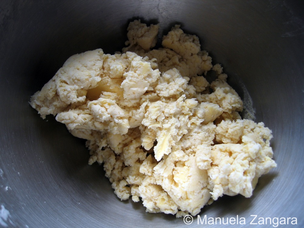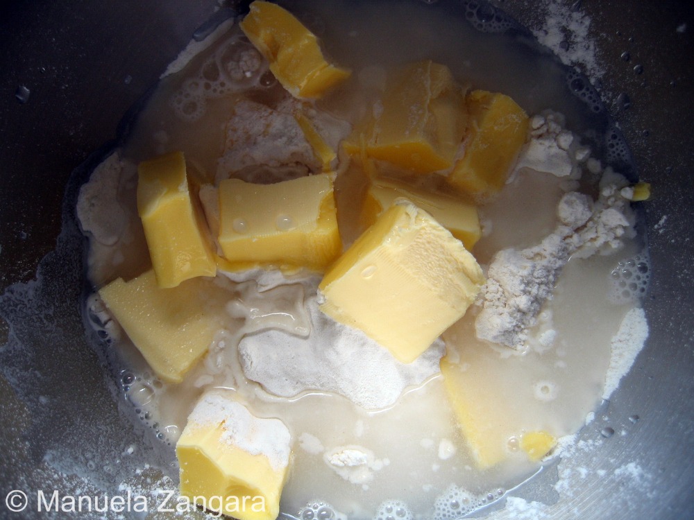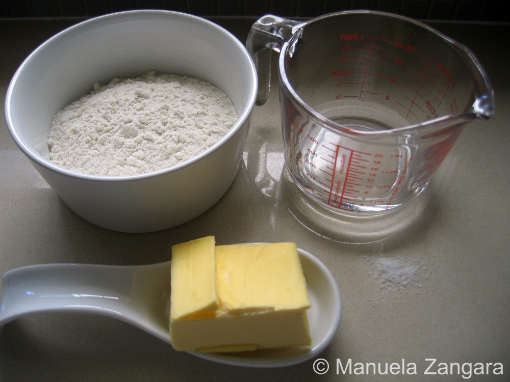 Put the flour, chopped cold butter, salt and water in a mixer with a paddle attachment and knead until you get an elastic dough.